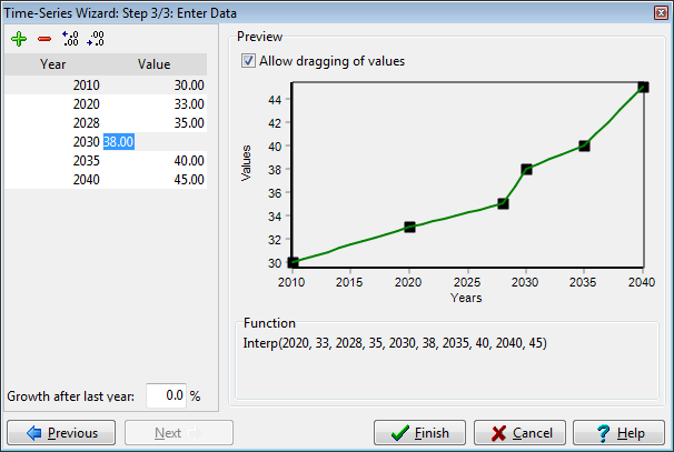 LEAP 包括许多内置工具,可以轻松创建复杂的模型和投影。时间序列向导允许您通过将数据直接输入 LEAP 或通过导入数据或创建到 Excel 电子表格的链接来创建插值、阶跃函数和各种趋势预测。