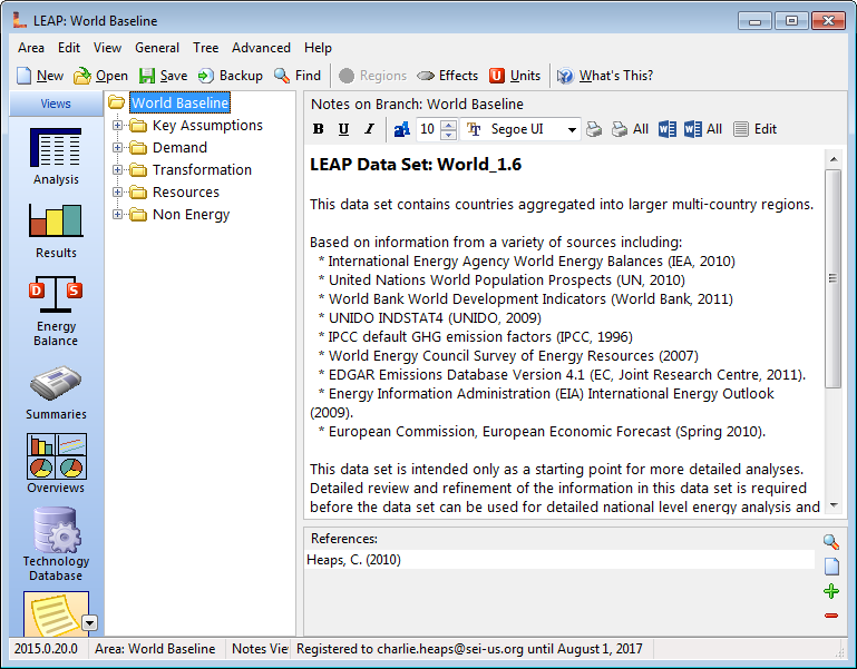 无论分析设计得多么好,它的用处将取决于它被记录和引用的程度。LEAP 中的 Notes View 通过提供一个带有内置书目参考数据库的简单文字处理工具来帮助解决这个问题。注释视图鼓励用户记录他们的数据、假设和方法。可以在树数据结构的每个分支处输入注释,然后打印或导出到 Microsoft Word 以用于报告。
