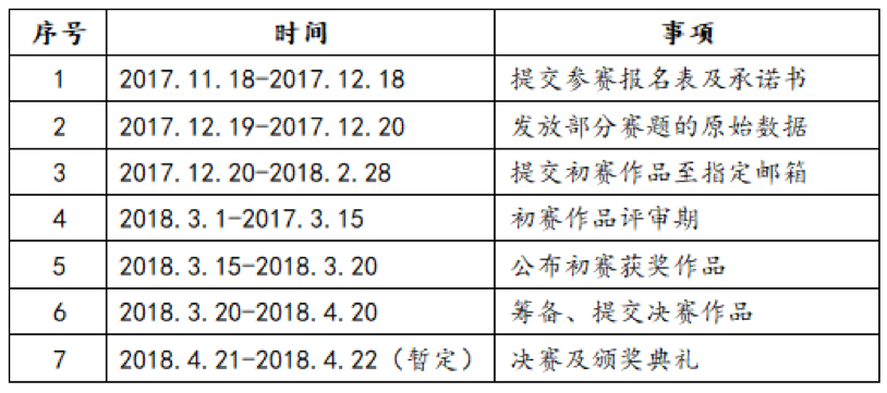 各参赛队伍需从大赛组委会给定的赛题中任选一题,并在大赛报名表中清楚标注所选题目。报名期结束后(2017年12月19日-20日),部分赛题会由组委会统一发放原始数据。